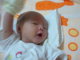 Today is my Full Month celebration. Before going to my own house for celebration, Ajussi Lee came to popo's house early in the morning to shave my hairs!!! Omma saw he shave my hairs very heartpain BUT for the sake of making me more yepoyo (mean beautiful), die die must shave the hairs as i dun want when I grow up to be like omma and ah yee.......who have little (no) hairs! keke......